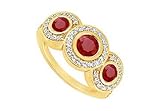 | ✚✚✚ Ruby and Diamond Engagement Ring : 14K Yellow Gold - 0.66 CT TGW Size 4.5 Three large brilliant-cut rich red rubies are bezel-set & encircled by smaller round diamonds. Made in 14K yellow gold this engagement ring has a total weight (TGW) of 0.66 ct.