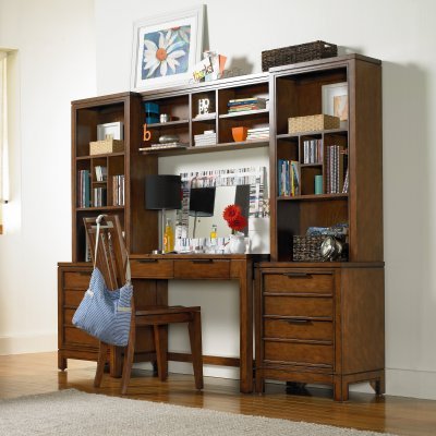 Carter Study Desk . The Carter Study Desk is a fun and sophisticated piece of furniture your child can continue using as they grow.The Carter Study Desk features several storage options and display shelves. The hardwood construction and birch veneers make this a piece that will stand the test of time. Finished in a medium brown, this desk will complement your child's ever-growing style. Plus, this piece will work well with other Carter furniture pieces (sold separately) ... check out the entire collection.About Hooker Furniture CorporationFor 83 years, Hooker Furniture Corporation has produced high-quality, innovative home furnishings that seamlessly combine function and elegance. Today, Hooker is one of the nation's premier manufacturers and importers of furniture and seeks to enrich the lives of customers with beautiful, trouble-free home furnishings. The Martinsville, Virginia, based company specializes in lifestyle driven furnishings like entertainment centers, home office furniture, accent tables, and chairs.Construction of Hooker FurnitureHooker Furniture chooses solid woods and select wood veneers over wood frames to construct their high-quality pieces. By using wood veneer, pieces can be given a decorative look that can't be achieved with the use of solid wood alone. The veneers add beautiful accents of color and design to the pieces, and are placed over engineered wood product for strength. All Hooker wood veneers are made from renewable resources and are located primarily on the flat surfaces of the furniture, such as the case tops and sides.Each Hooker furniture piece is finished using up to 30 different steps, including 13 steps of hand-sanding and accenting. Physical distressing is done by hand. Pieces receive two to three coats of solid lacquer to create extra depth and add durability to the finish. Each case frame is assembled using strong mortise-and-tenon joints, which are then reinforced by mechanical fasteners and glue. On most designs, end panels extend to the