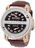 Ritmo Mundo Men's D201/1 SS RG Diamond Persepolis Triple-Time Orbital Case Quartz WatchThe Ritmo Mundo Men's Quartz Persepolis Triple Time Zone Watch is a true original with triple-time-zone capability. The patented orbital case is made of silver-tone stainless steel and allows this timepiece to display two separate 'faces'. A silver-tone stainless steel bezel matches the retrograde hour and minute hands on each of the three black dials. One side of the watch displays two separate time zones, with silver-tone Roman numerals and silver-tone indices. The opposite side of the watch showcases a third time zone with hours displayed on the top dial in silver-tone Arabic numerals and five-minute increments displayed on the bottom dial. The black silicone strap bears the Ritmo name and securely fastens with a buckle clasp. This timepiece offers reliable Swiss quartz movement and is protected by an antireflective sapphire crystal. The watch is water resistant to a depth of 165 feet (50 meters).